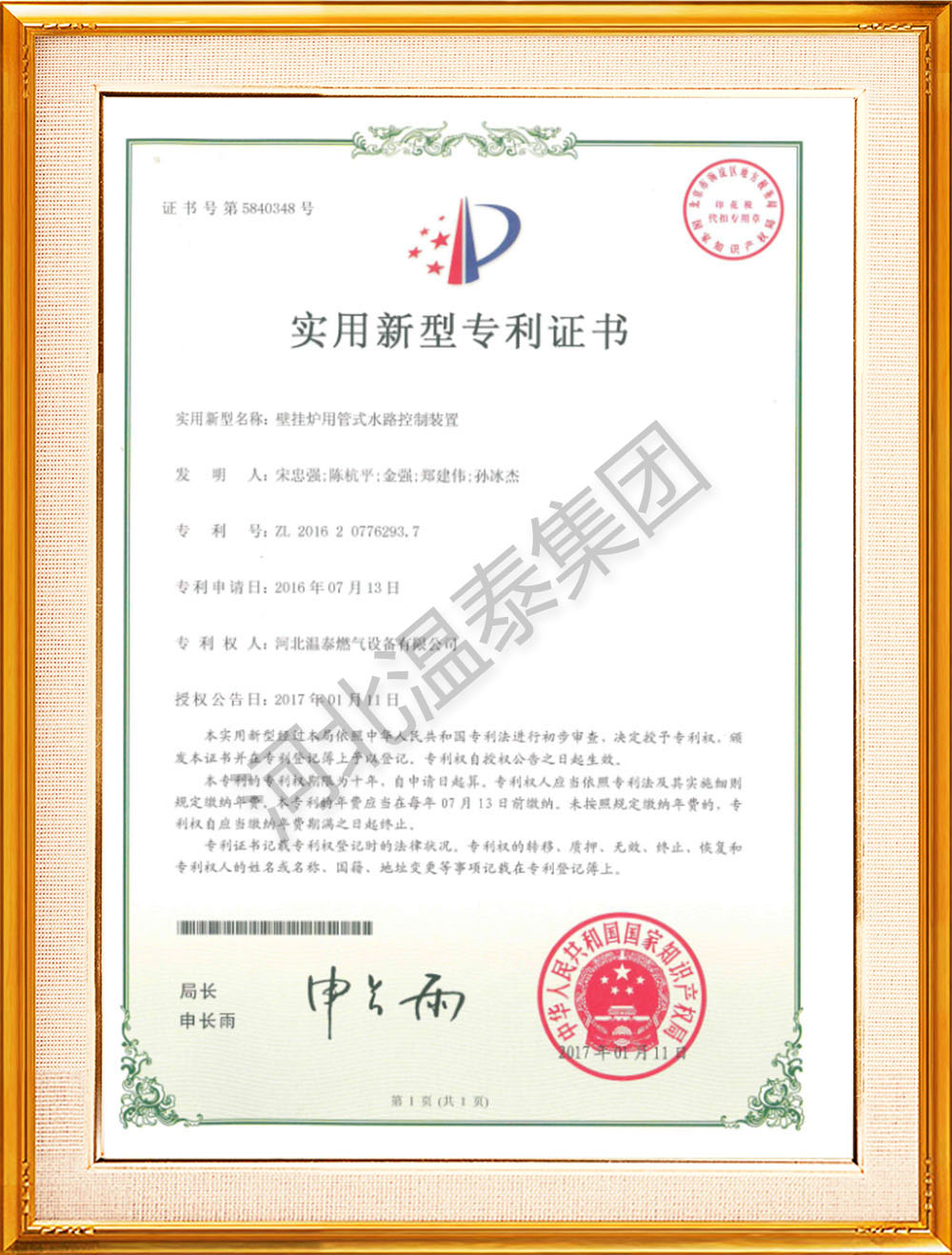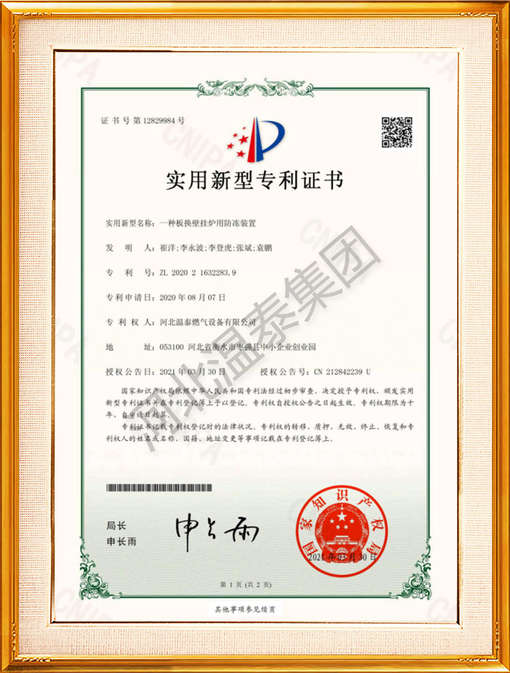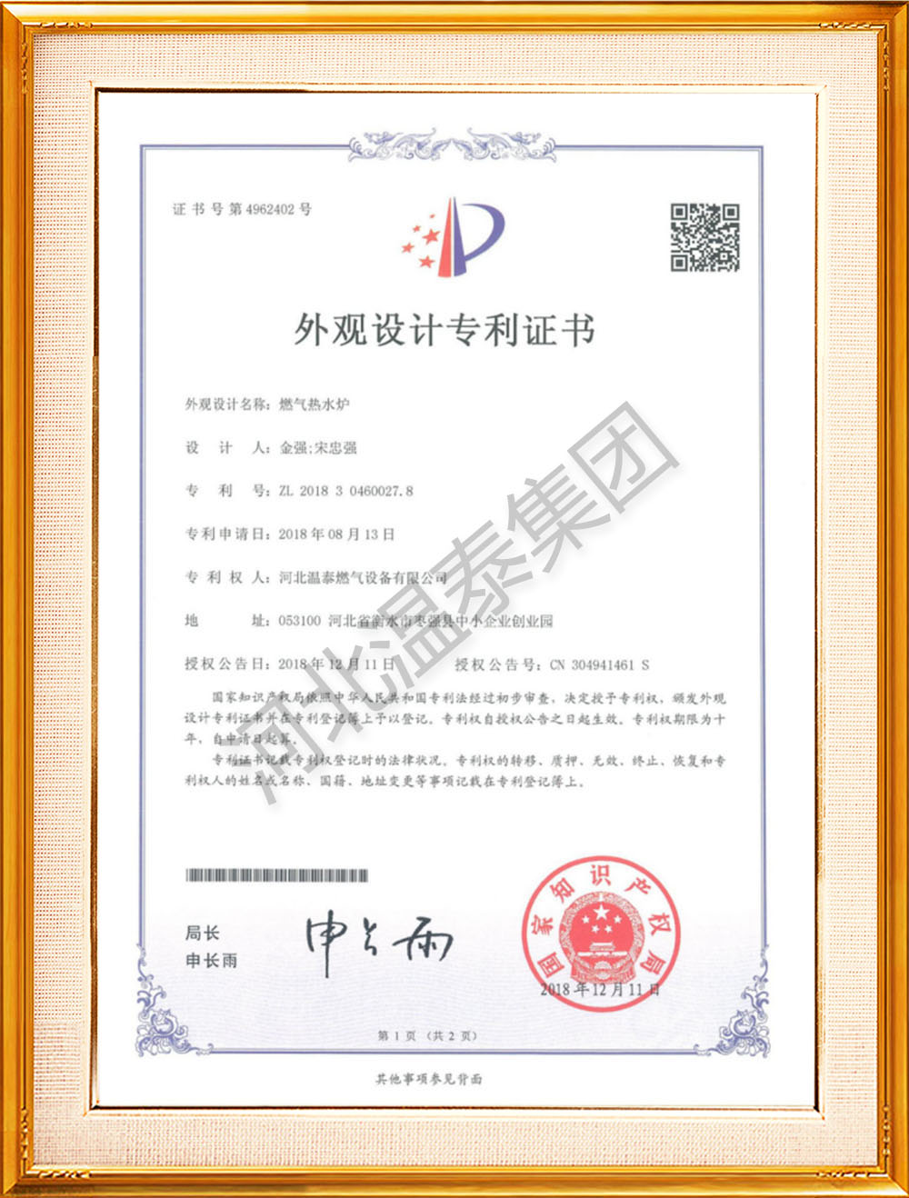 外觀設(shè)計專利證書(燃?xì)鉄崴疇t)