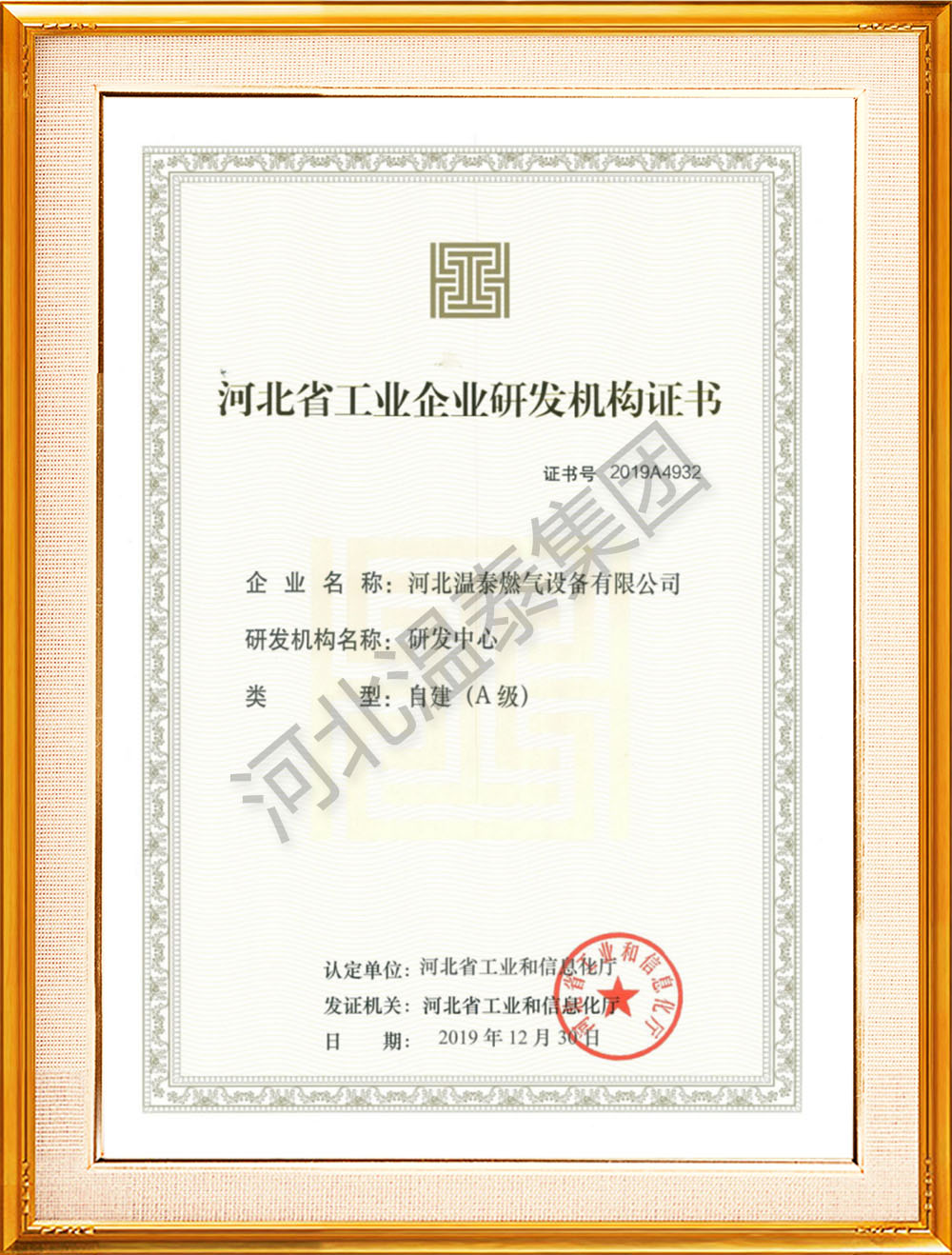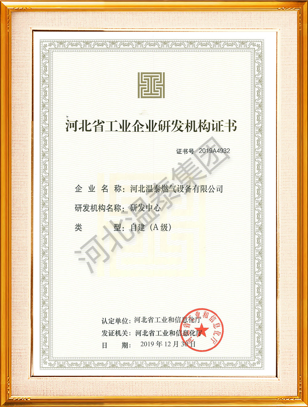 河北省工業(yè)企業(yè)研發(fā)機(jī)構(gòu)證書