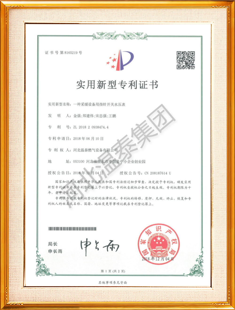指針開關(guān)水壓表專利證書 -