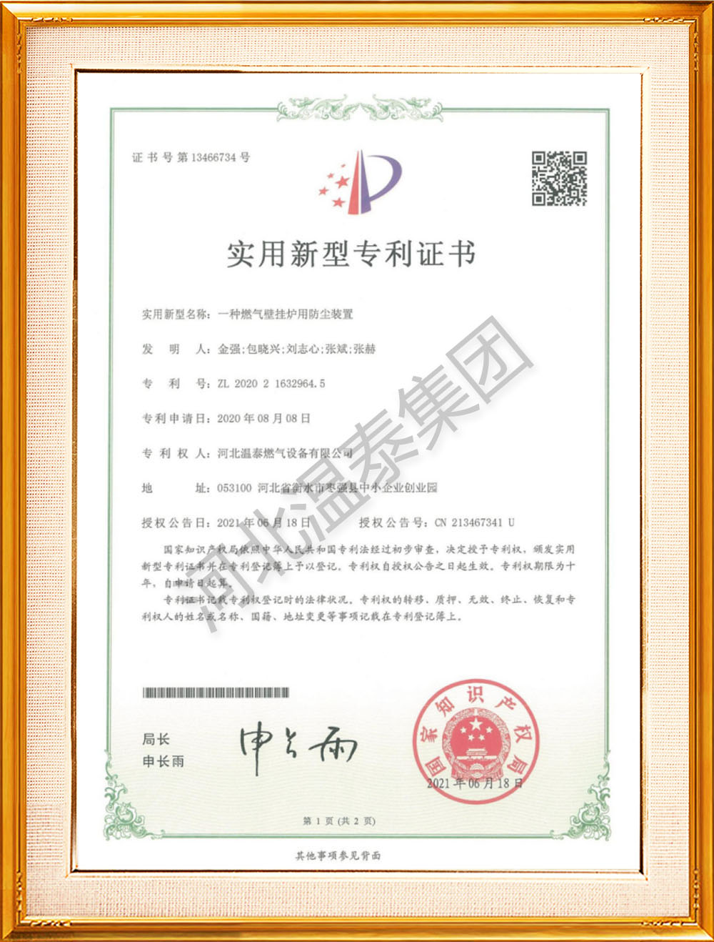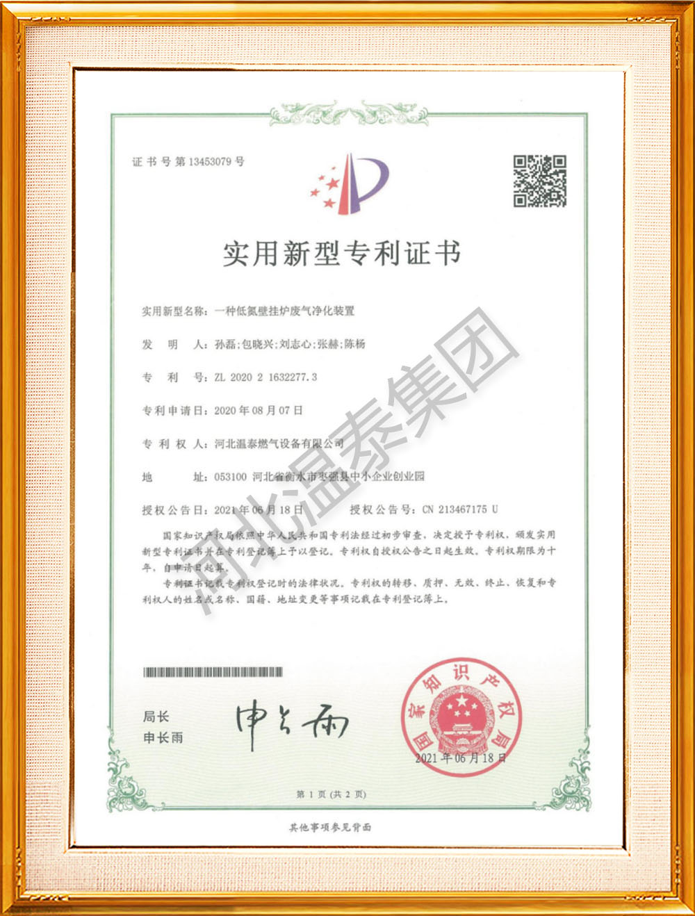 低氮壁掛爐廢氣凈化專利證書 -