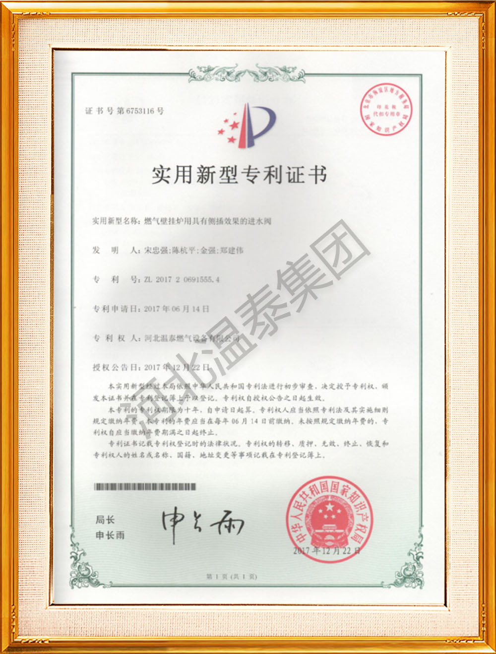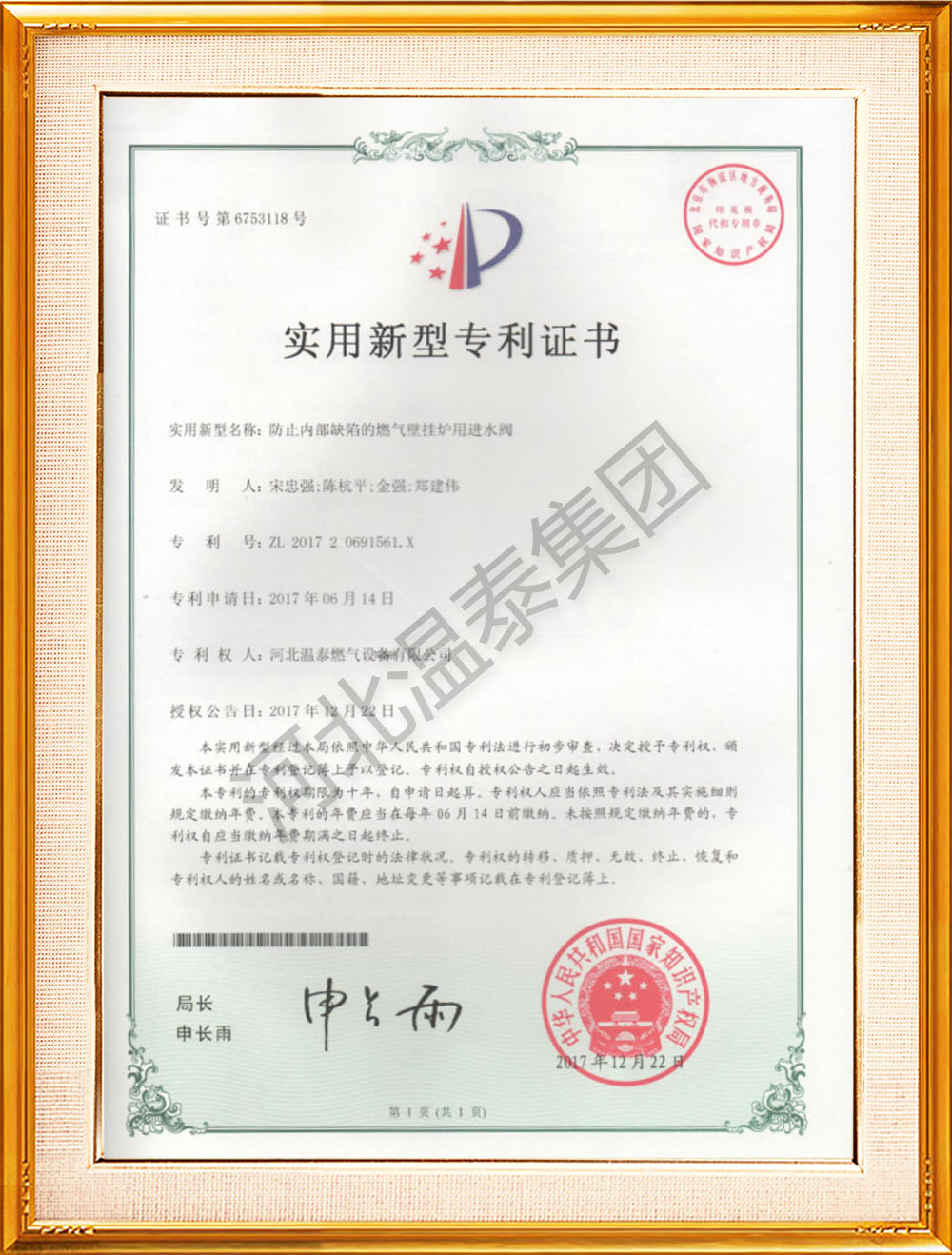 放置壁掛爐內(nèi)部缺陷進(jìn)水閥專利證書