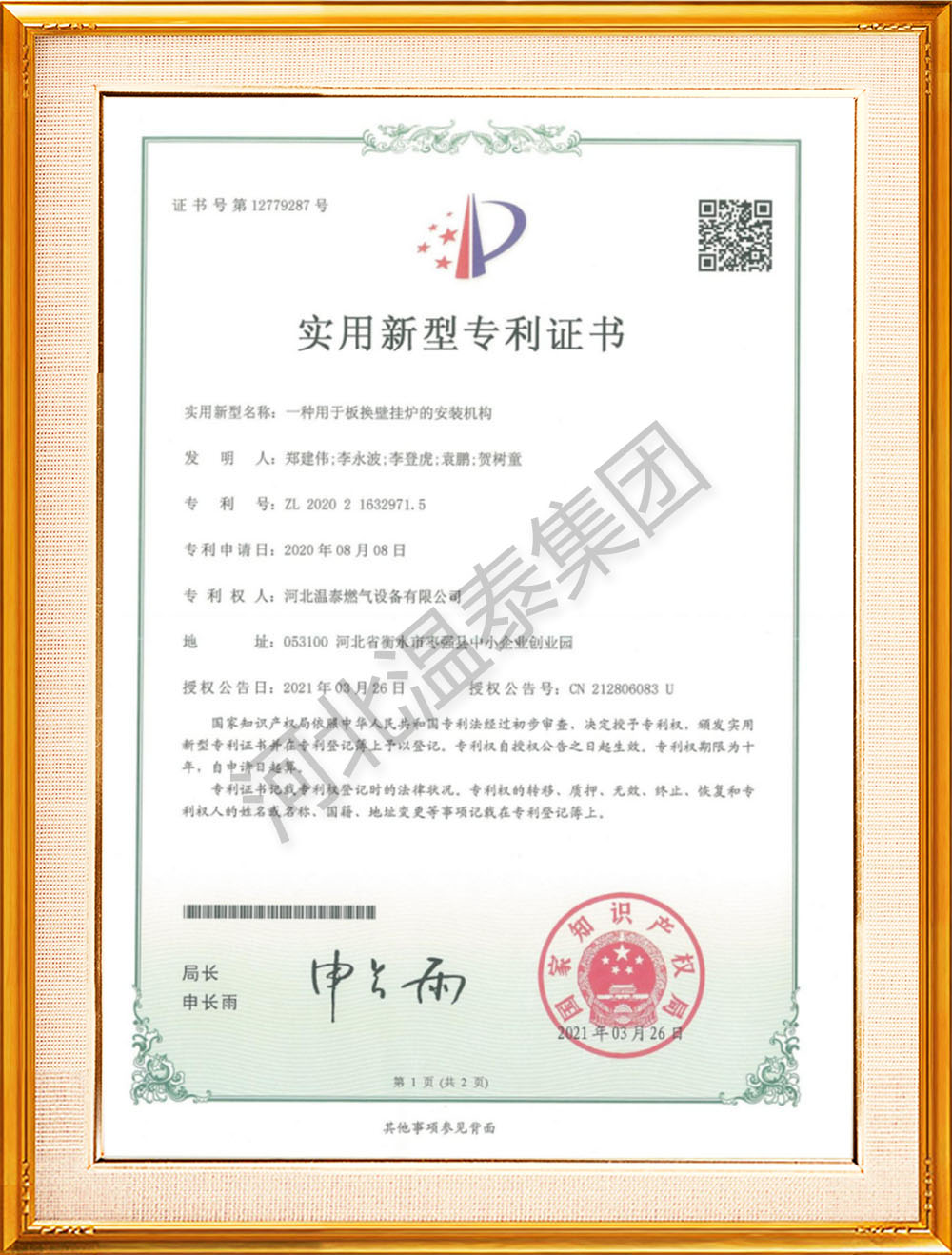 壁掛爐安裝機(jī)構(gòu)專利證書 -